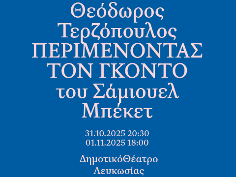 Το Διεθνές Φεστιβάλ Λευκωσίας ενημερώνει το κοινό ότι οι προγραμματισμένες για την Παρασκευή 31 Οκτωβρίου και το Σάββατο 1η Νοεμβρίου 2025 παραστάσεις του θεατρικού έργου «Περιμένοντας τον Γκοντό» σε σκηνοθεσία του Θεόδωρου Τερζόπουλου, αναβάλλονται λόγω αιφνίδιας ασθένειας ενός εκ των πρωταγωνιστών.