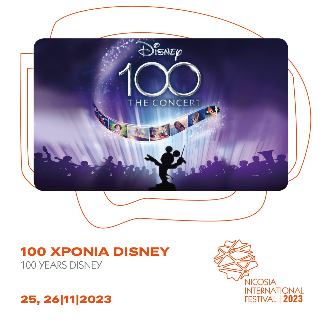 Το Διεθνές Φεστιβάλ Λευκωσίας 2023 παρουσιάζει μια συναυλία που αποτελεί μέρος των επίσημων εορτασμών για τα 100 χρόνια της Disney. Εκατό χρόνια μαγείας με τραγούδια και μουσικά θέματα από τις πιο αγαπημένες ταινίες της Disney που ζωντανεύουν στη σκηνή του Δημοτικού Θεάτρου Λευκωσίας από μια ορχήστρα 56 μουσικών και σημαντικούς τραγουδιστές του West End. Η συναυλία αποτελεί μοναδική οπτικοακουστική εμπειρία με φόντο ταινίες που έμαθαν σε μικρούς και μεγάλους να ονειρεύονται, όπως: Alladin, Lion King, Little Mermaid, Frozen, Beauty and the Beast, Mary Poppins και Encanto.