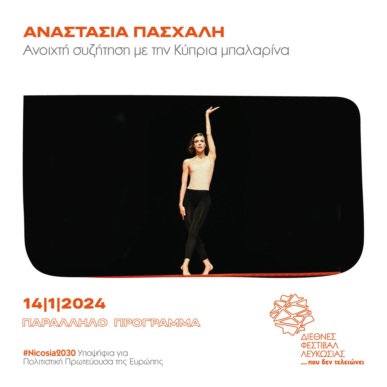 Στο πλαίσιο του Παράλληλου Προγράμματος του Διεθνούς Φεστιβάλ Λευκωσίας… που δεν τελειώνει, η Αναστασία Πασχάλη προσκαλεί τη νέα γενιά, σε μια βραδιά χορού και συζήτησης στις 14 Ιανουαρίου, στις 19:00, στο Δημοτικό Θέατρο Λευκωσίας. Η Κύπρια μπαλαρίνα θα μοιραστεί τις εμπειρίες και χαρές, τις δυσκολίες, τα μαθήματα ζωής, αλλά και τις πιο πολύτιμες στιγμές της καριέρας της, μέσα από φωτογραφίες και βίντεο, σε μια ανοιχτή συζήτηση με το κοινό. Θα παρουσιάσει επίσης, μια σύντομη χορογραφία με τίτλο «2-1+1», στην οποία θα χορέψουν πέντε νεαρές, ταλαντούχες χορεύτριες οι Σοφία Χατζηγεωργίου, Ευαγγελία Λάμπρου, Μαρία Γερασίμου, Μικαέλλα Νεοφύτου και Σώτια Νικολάου.