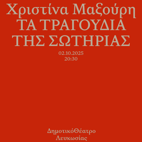 Το Διεθνές Φεστιβάλ Λευκωσίας 2025 παρουσιάζει την ξεχωριστή μουσική παράσταση «Τα τραγούδια της Σωτηρίας» με την Χριστίνα Μαξούρη, την Πέμπτη 2 Οκτωβρίου, στο Δημοτικό Θέατρο Λευκωσίας στις 20:30.
