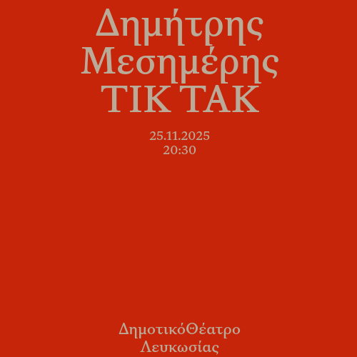 Ο τραγουδοποιός Δημήτρης Μεσημέρης σε μια αναμέτρηση με τον… χρόνο παρουσιάζει τον νέο του δίσκο με τίτλο «ΤΙΚ ΤΑΚ», στο Διεθνές Φεστιβάλ Λευκωσίας 2025, την Τρίτη 25 Νοεμβρίου, στο Δημοτικό Θέατρο Λευκωσίας (20:30). Πρόκειται για μια συναυλία - παρουσίαση που αγγίζει τις ανθρώπινες εμπειρίες μέσα από τη διαδρομή του χρόνου και τους σταθμούς της ζωής.