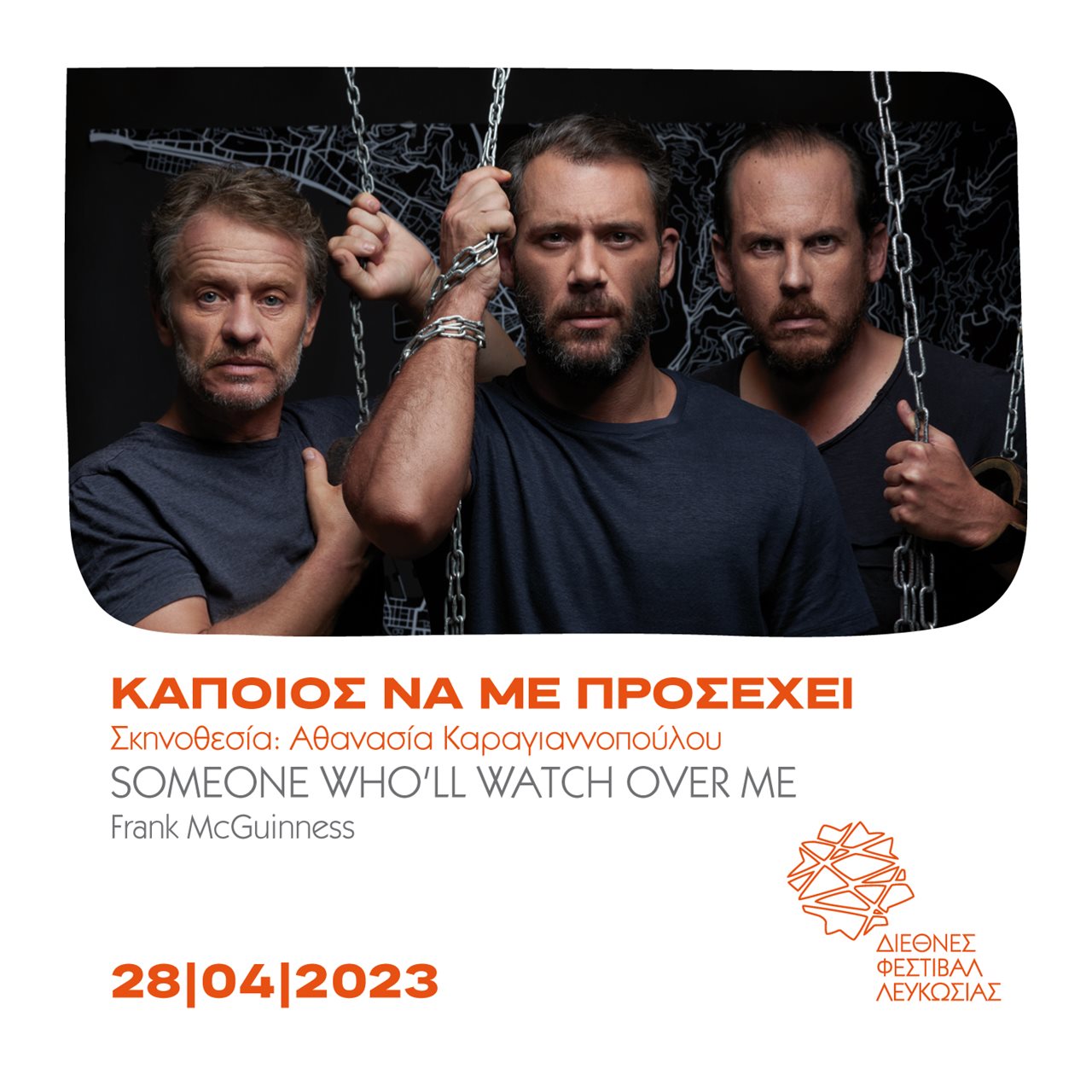 The Nicosia International Festival team continues its off-festival programming and presents Frank McGuinness’s play “Someone who'll watch over me”. Following consecutive sold-out performances at Theatro Avlaia in Thessaloniki and at Sychrono Theatro in Athens, Athanasia Karagiannopoulou’s acclaimed production will be staged at the Nicosia Municipal Theatre on 28 April 2023 at 8:30 p.m. Starring Antinoos Almpanis, Dimitris Marizas and Peter Rundle.