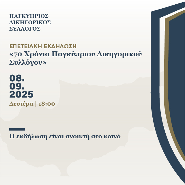 Ο Παγκύπριος Δικηγορικός Σύλλογος (ΠΔΣ) σας προσκαλεί σε μια ιδιαίτερη επετειακή εκδήλωση με αφορμή τη συμπλήρωση 70 χρόνων από την ίδρυσή του. Η εκδήλωση θα πραγματοποιηθεί τη Δευτέρα, 8 Σεπτεμβρίου 2025 και ώρα 18:00, στο Δημοτικό Θέατρο Λευκωσίας, στην τιμητική παρουσία του Εξοχότατου Προέδρου της Κυπριακής Δημοκρατίας κ. Νίκου Χριστοδουλίδη.