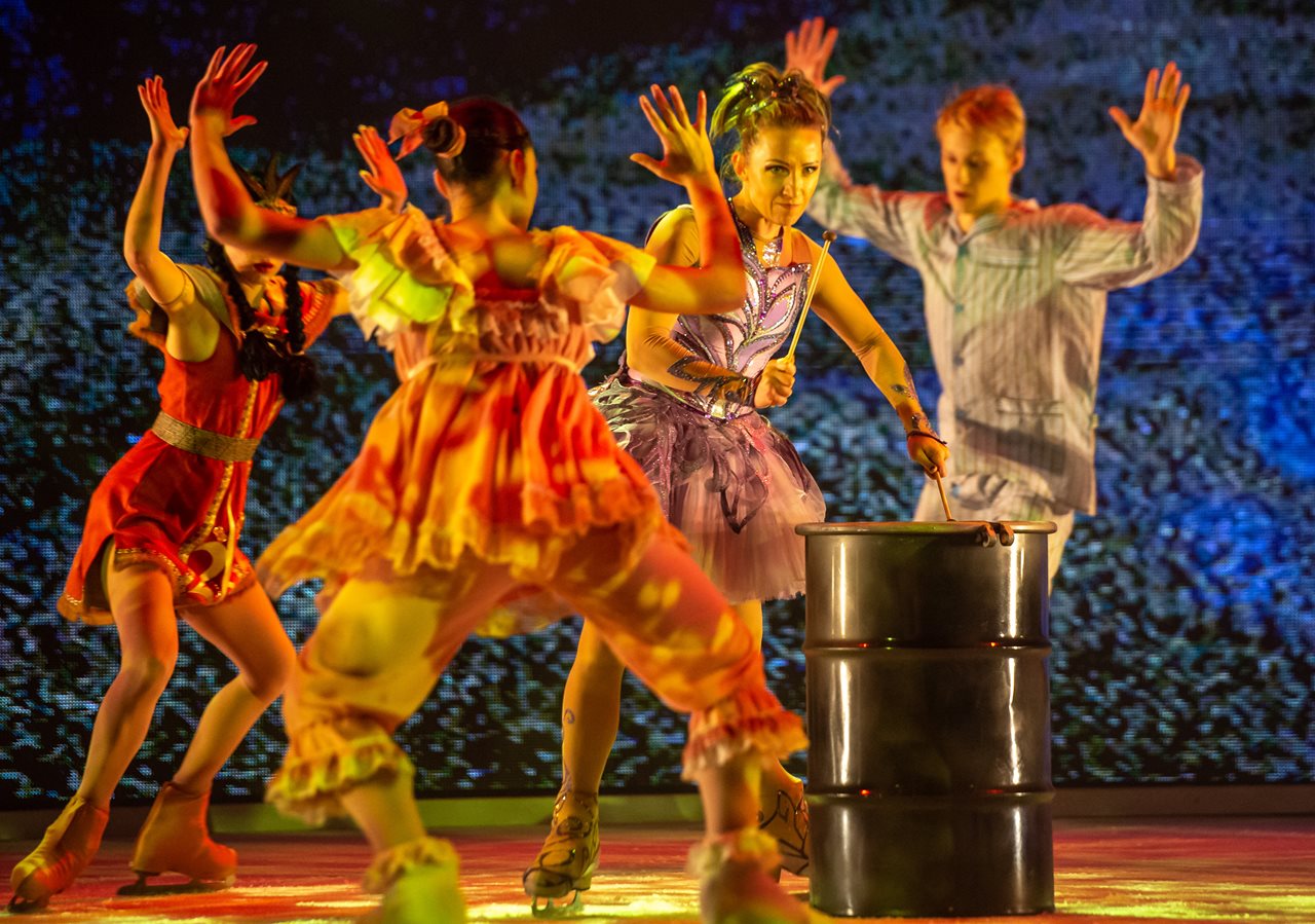 The show takes place on environmentally friendly ice that does not require freezing. New synthetic ice technology.